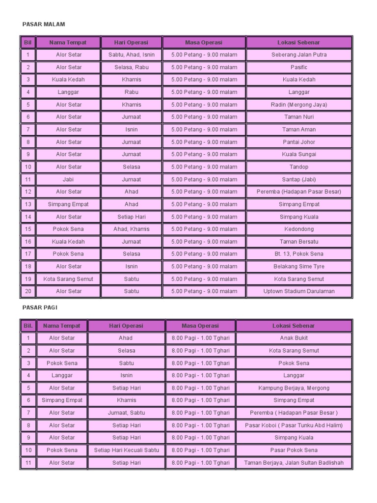 2013-10-08 PASAR MALAM Bil Nama Tempat Hari Operasi Masa Operasi Lokasi Sebenar 1 Alor Setar Sabtu Ahad Isnin 500 Petang - 900 malam. Saya akan cuba menggambarkan keseluruhan apa yang ada kepada anda sebaik mungkin. Pengarah Urusan Syarikat Saudagar-Saudagar Ikan Sdn Bhd Datuk Koay Hai Kiang mengesahkan perkara itu selepas surat pemakluman berkaitan kes positif Covid-19 tular pada.